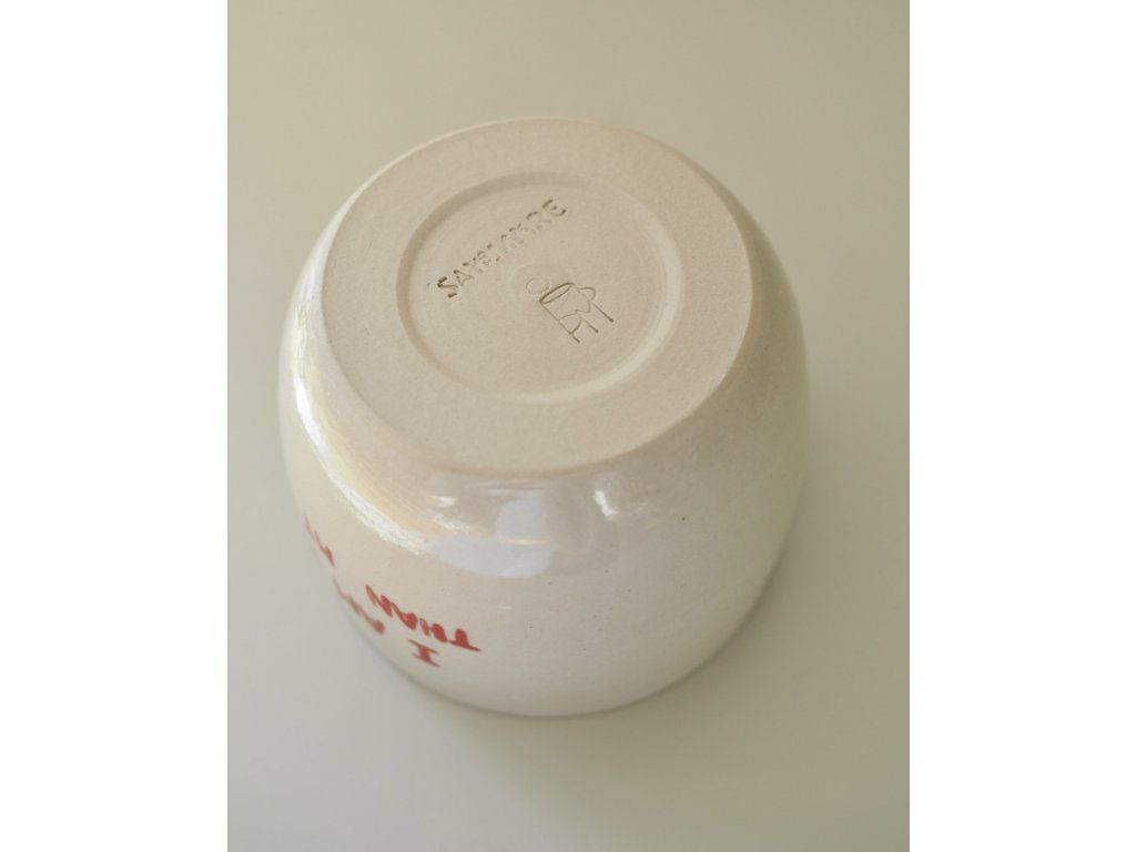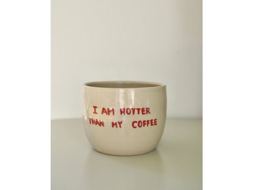 The ceramic cup with the inscription “hotter than my coffee” was freely turned on a potter's wheel and then fired twice at high temperatures in an electric ceramic kiln. Thanks to the high-temperature firing, it is also dishwasher safe, but to maintain its shine and long life, I recommend hand washing.