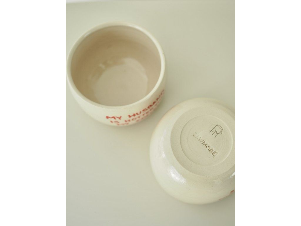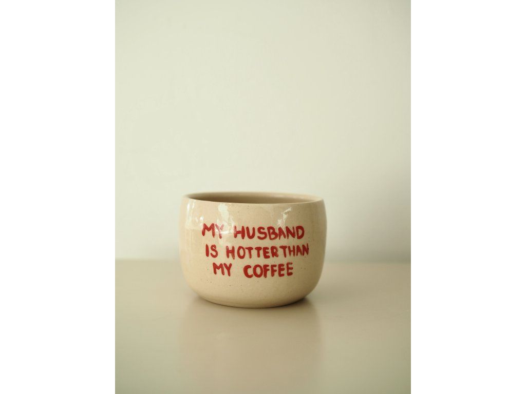 The ceramic cup with the inscription “my husband is hotter than my coffee” was freely turned on a potter's wheel and then fired twice at high temperatures in an electric ceramic kiln. Thanks to the high-temperature firing, it is also dishwasher safe, but to maintain its shine and long life, I recommend hand washing.