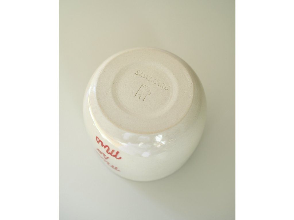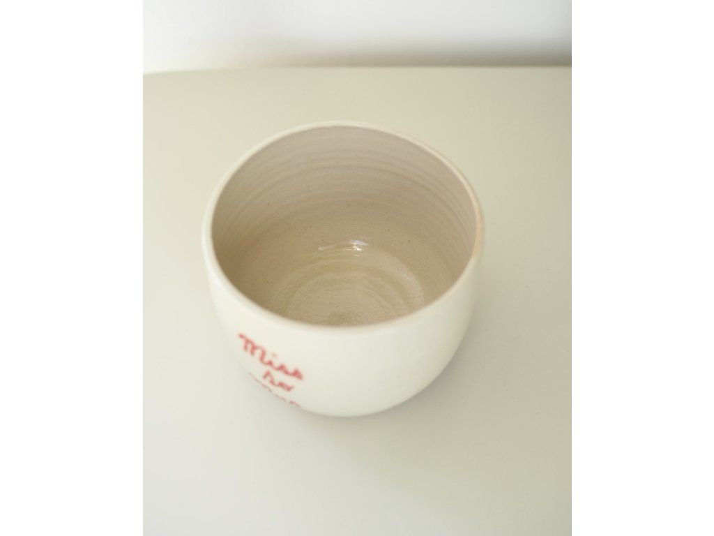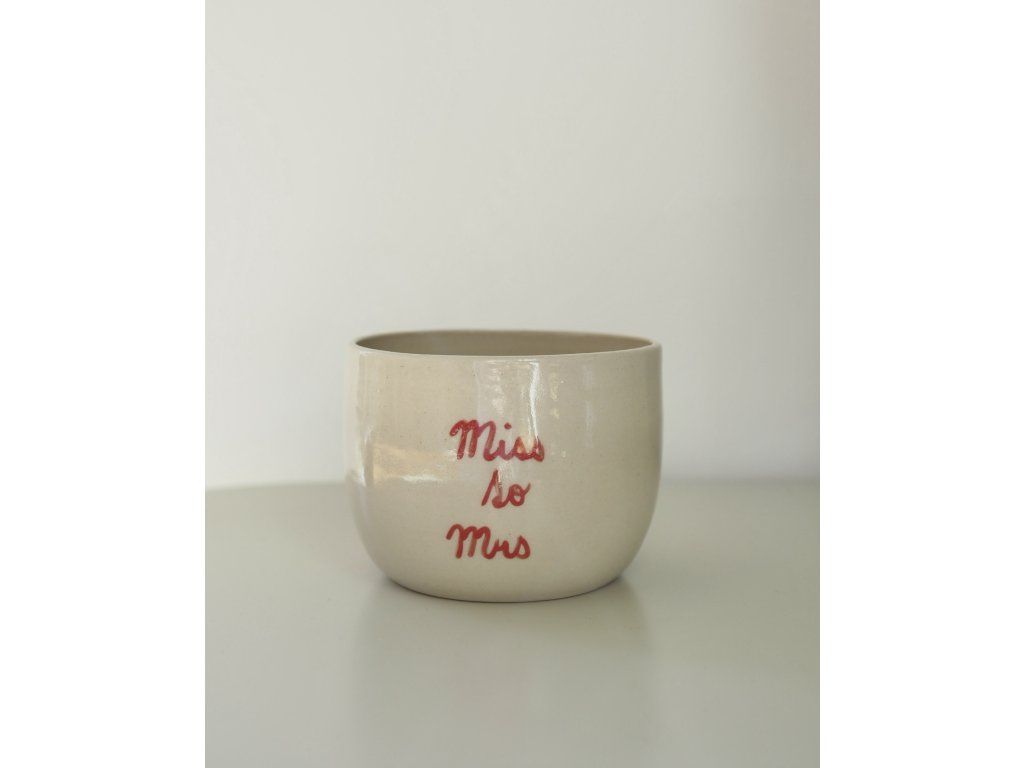 The ceramic cup with the inscription “miss to mrs” was freely turned on a potter's wheel and then fired twice at high temperatures in an electric ceramic kiln. Thanks to the high-temperature firing, it is also dishwasher safe, but to maintain its shine and long life, I recommend hand washing.
